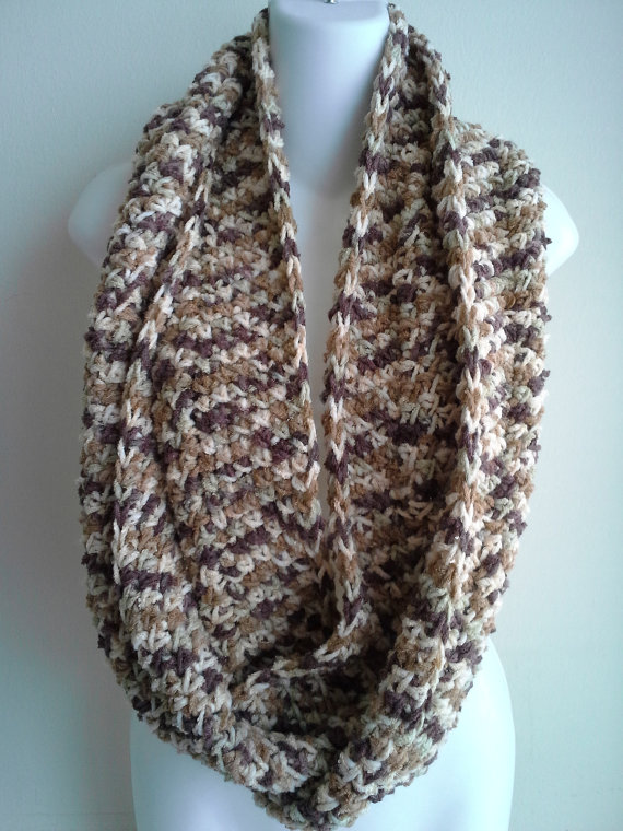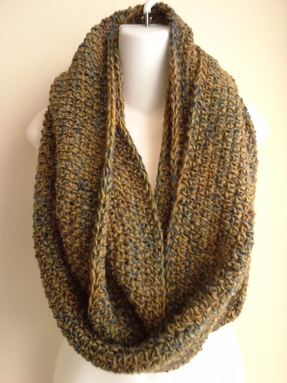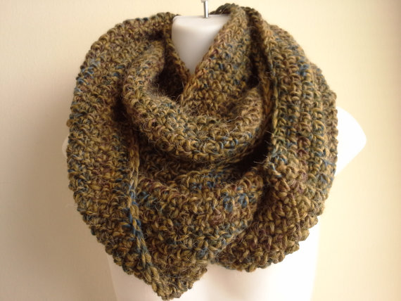 The top is Long Chunky Infinity Scarf Brown Cream PERRI. The other is Fern Green Alpaca Blend Infinity Scarf Unisex LINDEN.
